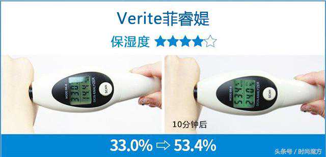 测试结果显示,Verite菲睿媞使用卸妆水洁面后肌肤水分增加了20.4%。