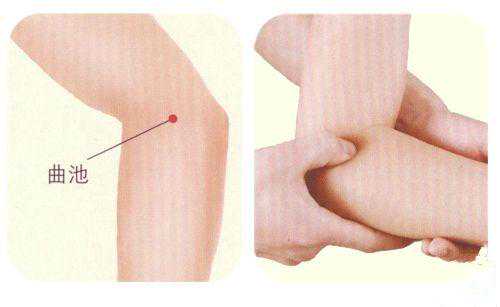 (位置:胳膊的上臂和小臂呈90度放在桌子上,可以看到胳膊肘处有一个横纹,胳膊肘外边有个骨头尖(肱骨外上髁),在横纹的尽头和骨头尖两个点中间就是曲池穴。)