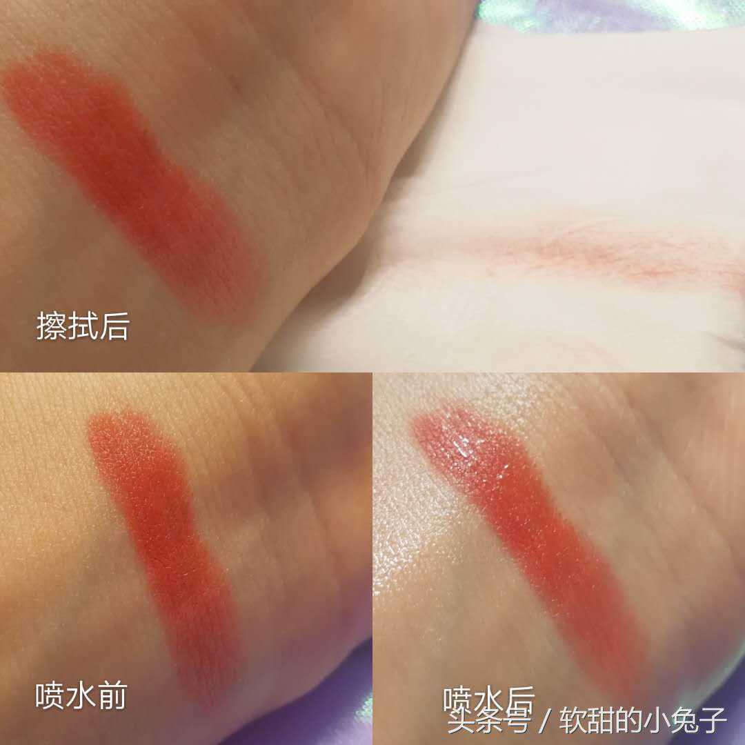 测评方式:现在手腕上均匀地涂上一道口红,之后再喷两次喷雾,观察它的颜色有没有融化,并用纸巾擦拭,看它的掉色现象严不严重。