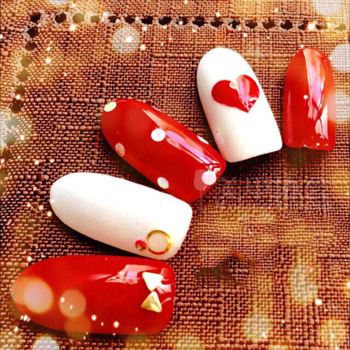 同样的红白搭配,可以再加一点点的金色的小装饰,让甲面看起来可爱的同时又不乏轻奢感,再搭配上亮色的衣服,非常显白显气色。