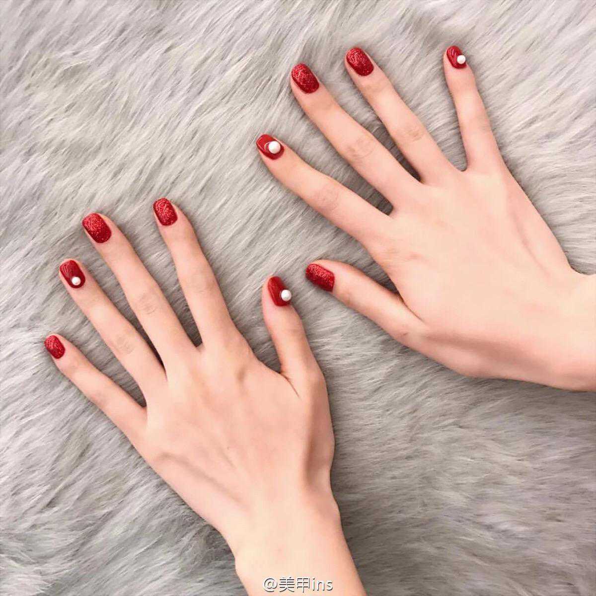 如果不想要太艳的红色,可以考虑换成暗红色,再加上白色的小珍珠点缀,避免了单色红的乏味,让整体在沉稳中又不失可爱。再搭配上一个复古的红唇,一下就能让你变的妩媚动人。