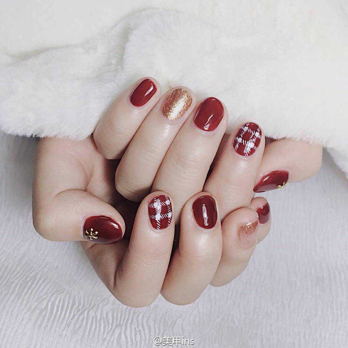 如果想要多一点可爱感,可以像这样加上白色的方格花纹,再单涂一个金色,让整体甲面看起来有趣而充满变化。白色和金色的加入,让暗红色显得不仅不沉闷,还极具质感。