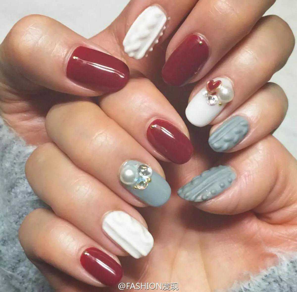 低调的暗红色配上闪亮的白珍珠,满满的精致感。远看可能不显山不露水,但仔细看就能感受到你细腻的小心思。这种有质地感的暗红色,非常适合冬季。