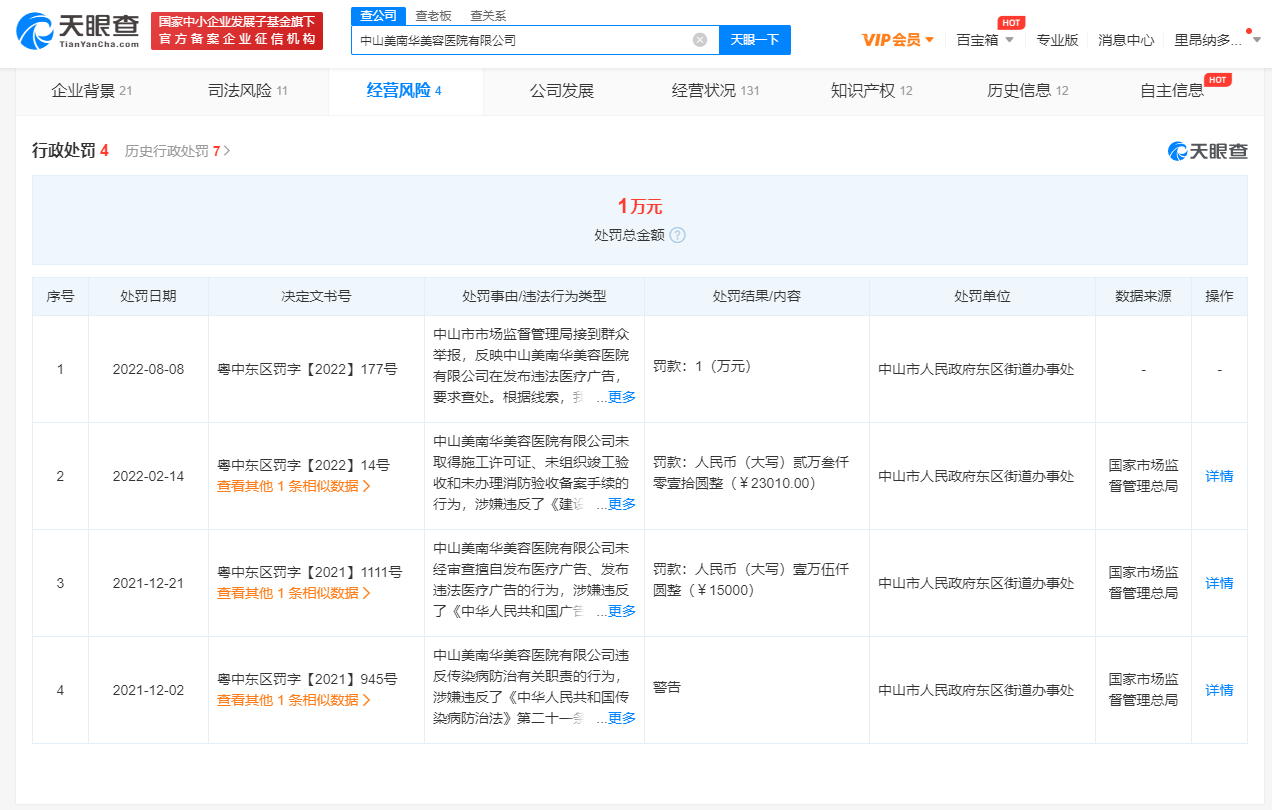 值得一提的是,天眼查显示,去年12月,该公司就因擅自发布违法医疗广告,被中山市人民政府东区街道办事处罚款1.5万元。此外,该公司还曾因未取得施工许可证、未组织竣工验收和未办理消防验收备案,以及违反传染病防治法,分别被罚款、警告。