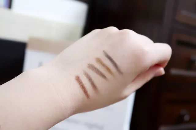 我用得最多的色号是e4,比较适合我。左1的e1是最新入的,我已经转到最大值了;右边两个都是e4,最右边的已经用秃噜了,马上就要用完了,一只半用完了,真的可以说是真爱的眉笔了。