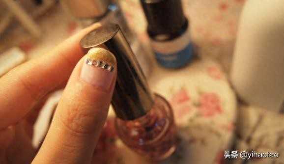 沿着金色闪粉边缘贴了一排至于胶水,要用美甲专用的结合剂贴完以后最后一道工序很重要