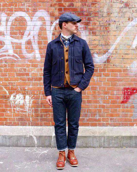4.工装夹克提到蓝色夹克也不能忘记经典的“法国工装夹克”,它最经典的款式就是蓝色,穿上它就能轻松打造出复古的工装风调。