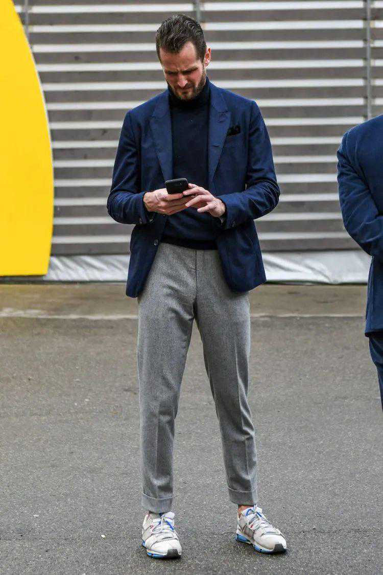 除了一如既往地打造正式的风格,在休闲时尚造型中西装的出镜率也会很高,打造出来的造型也很显绅士范。搭配九分西裤和高领毛衣的造型就简洁大气,很适合商务休闲风的伙伴,把皮鞋换成运动鞋造型就更加休闲时髦化。