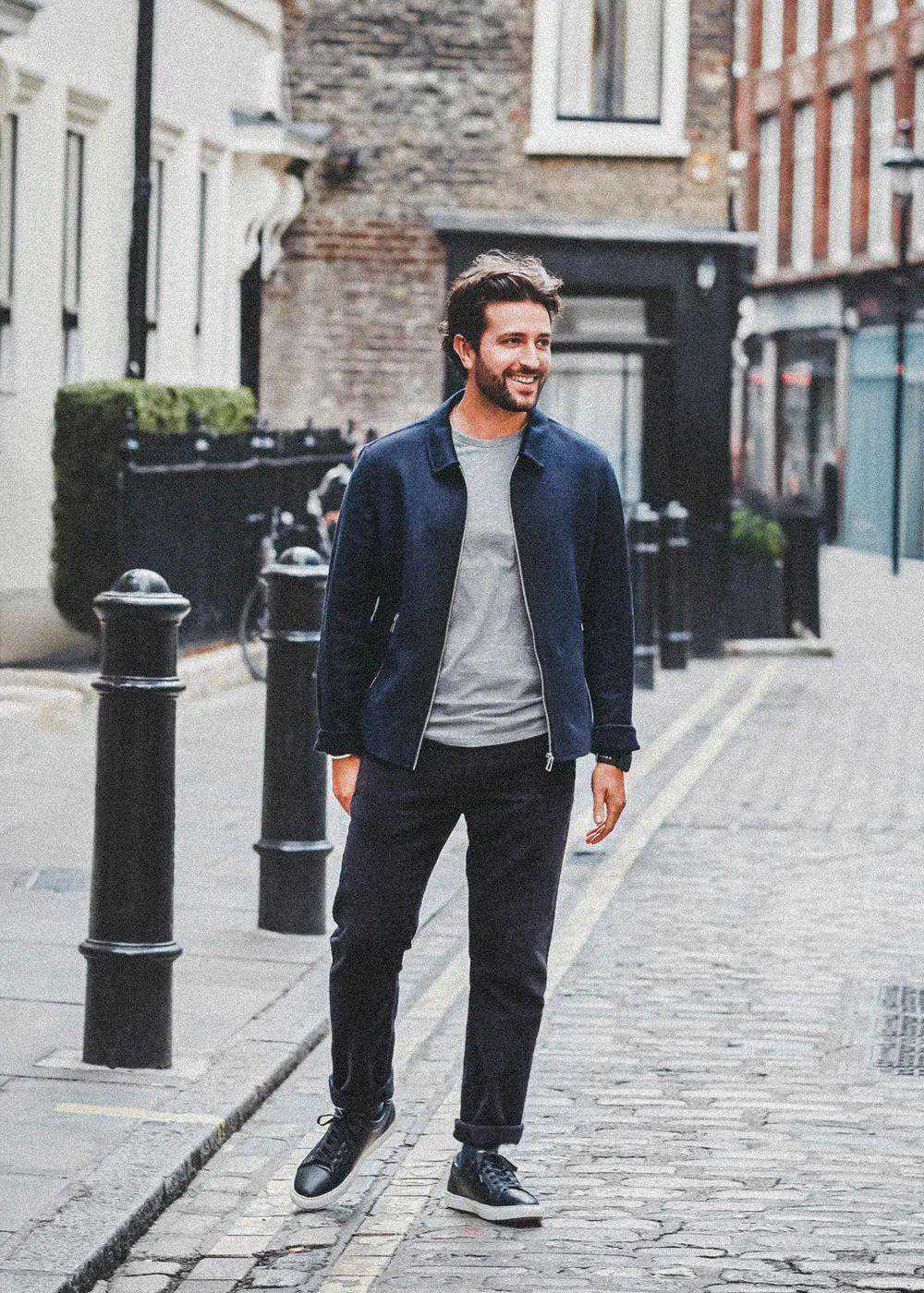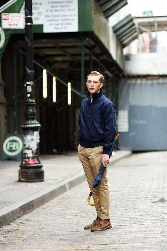 同样深蓝色的哈灵顿夹克百搭性也很好,能和各种风格的裤子组合起来,搭配一条卡其裤造型就很得体,轻松打出休闲时尚的风调。