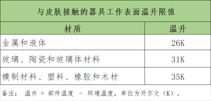 本次在对家用美容仪产品进行温升测试时,主要依据GB/T36419-2018《家用和类似用途皮肤美容器》标准附录要求,与使用者或被护理人身体接触的器具工作表面的温升要求如下: