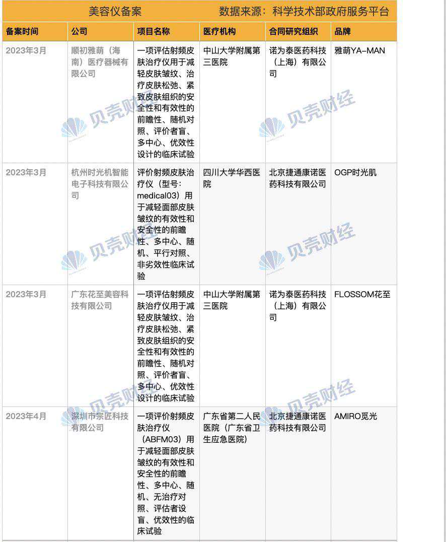 贝壳财经记者注意到,截至目前尚未有家用美容仪品牌取得第三类医疗器械证。根据国家科学技术部政府服务平台信息显示,2022年3月至今,仅有FLOSSOM花至、雅萌、OGP时光肌、AMIRO觅光4个品牌关联公司,申报了评估“射频皮肤治疗仪安全性和有效性”的临床试验。此外,MARYFAIRY玛丽仙也公开表示,成为“首批”进入射频类家用美容仪国家三类医疗器械技术审评的品牌。