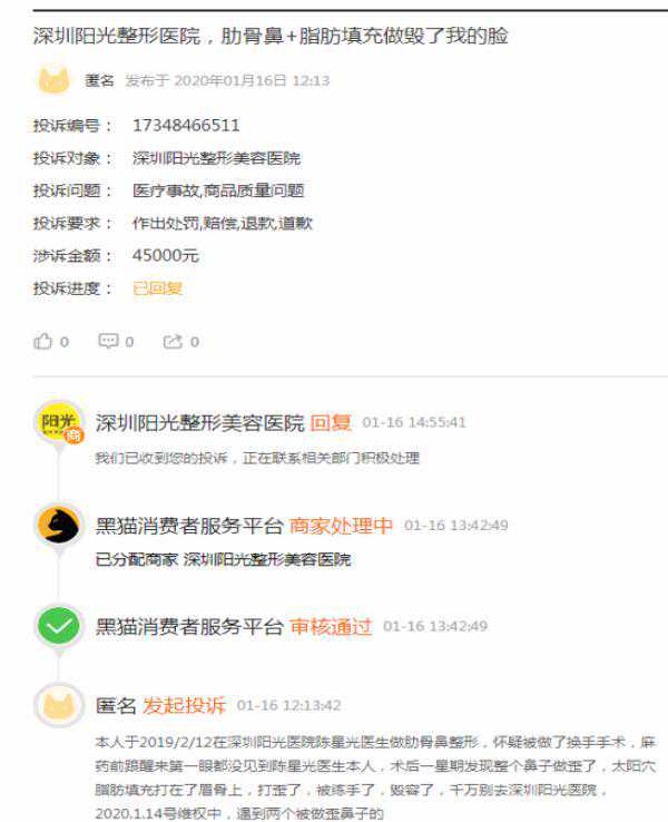 值得一提的是,深圳阳光整形美容医院于近期还遭到消费者投诉。网络投诉平台“黑猫投诉”显示,某消费者于2020年1月16日发布了对深圳阳光整形美容医院的投诉信息“深圳阳光整形医院,肋骨鼻+脂肪填充做毁了我的脸”,涉诉金额45000元。