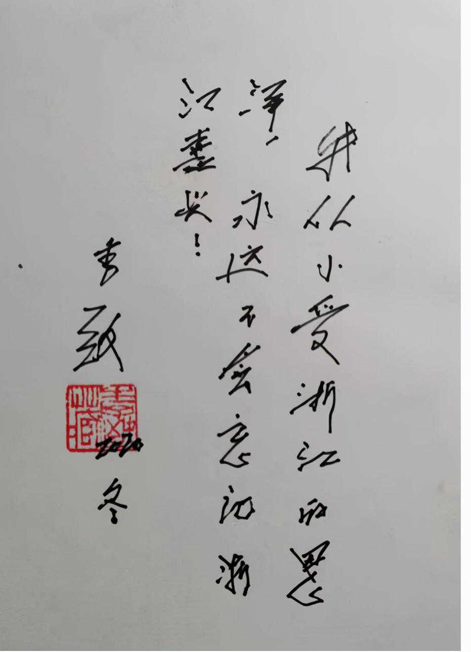 李老没深思,一边说:“好呀!”一边让其女儿找写字用的眼镜。准备就绪后,在我拿去的册页上,题写了“我从小受浙江的恩泽,永远不会忘记浙江嘉兴!”亦让其女儿取来新刻的印章,非常认真地在落款处盖上。
