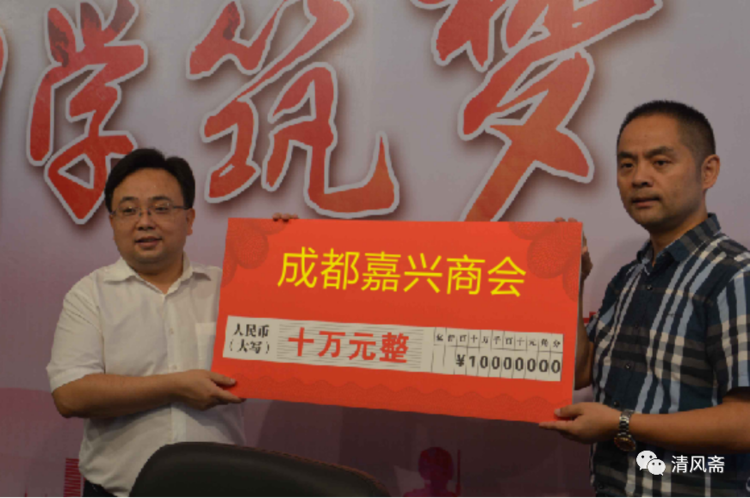 2019年9月,成都嘉兴商会向大邑县教育局捐资助学(左一杨学文局长,右一谢培杰会长)
