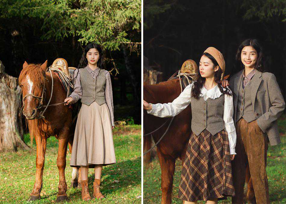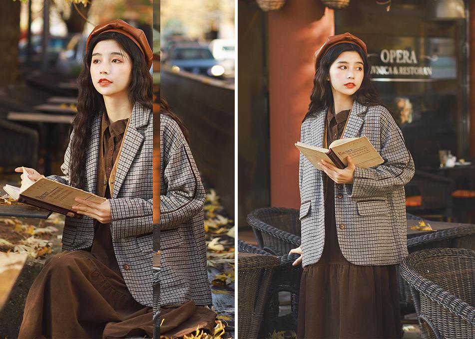复古的咖灰色、契合着敢冬的色调,给人一种高雅的气息,西装外套时合身宽松的H版型、略带一点硬朗的廓形、内搭的背心马甲、修饰身形、线条利落、V子的领口设计有修饰脸型的效果,整体复古显气质、又很有层次感。