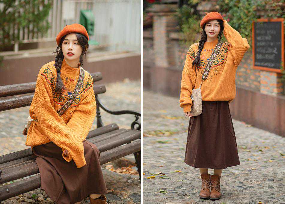 在白皑皑的冬日,真的太需要鲜艳的颜色来照亮你的美,这款毛衣,它的橘色不是那种脏脏的土橘色,而是超级显白的南瓜色。简洁干净、民族风的花纹、地域风情十分浓厚。