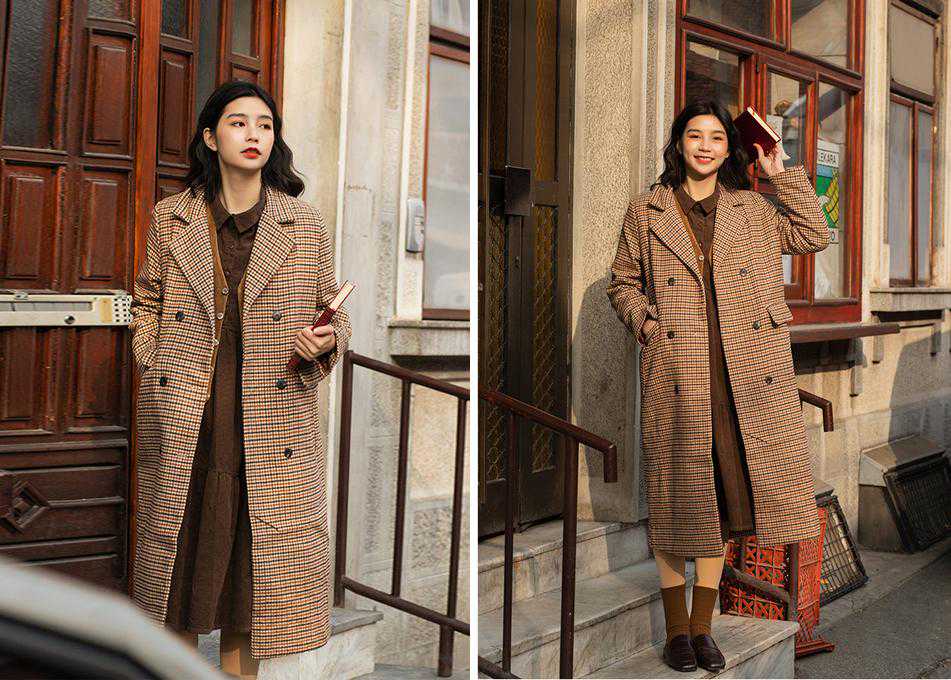 满满英伦气息,混色的千鸟格样式,复古又有型,翻领的样式气质感十足,适中的长度,对小个子来说也是可以驾驭的,完全不会压身高。
