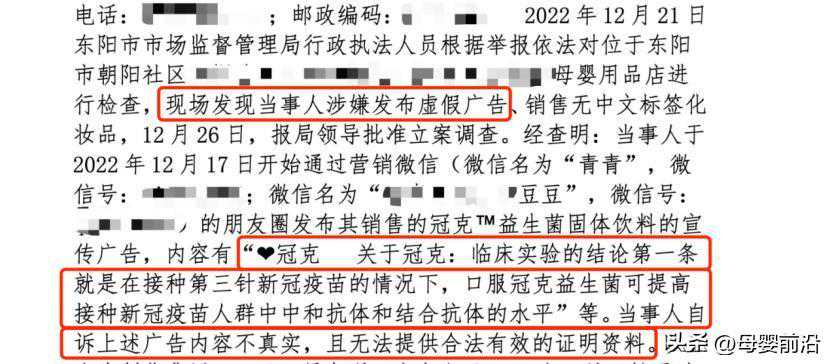 从处罚文件获悉,该母婴用品店在朋友圈发布宣传广告“关于冠克:临床实验的结论第一条就是在接种第三针新冠疫苗的情况下,口服冠克益生菌可提高接种新冠疫苗人群中和抗体和结合抗体的水平”等。