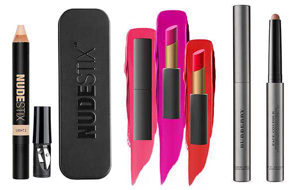 (从左至右)NUDESTIX羽德诗遮瑕笔、MarieDalgar玛丽黛佳ColorStudio佳瘾系列精华哑光唇膏以及Burberry博柏利今年推出的全新产品自然光影修颜笔。
