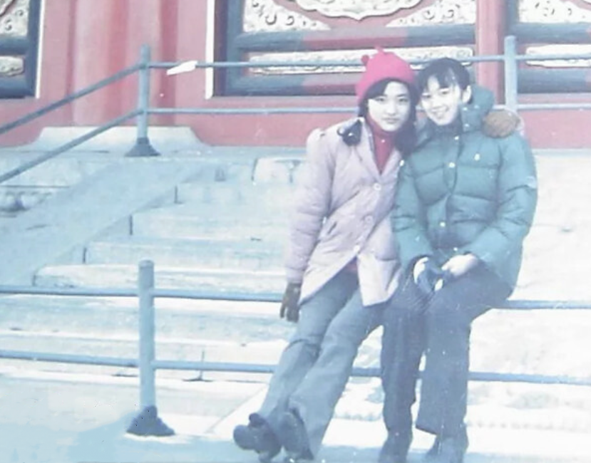 另一张照片中,周涛揽着好友的肩膀,两人坐在台阶前的栏杆上。她戴着红色毛线帽,扎着两个辫子,外套里搭配红毛衣,下身是牛仔喇叭裤,看起来年轻有活力,造型也很时髦。背景像是古建筑类型的旅游景点,这张照片也许便是周涛与好友的游客照。