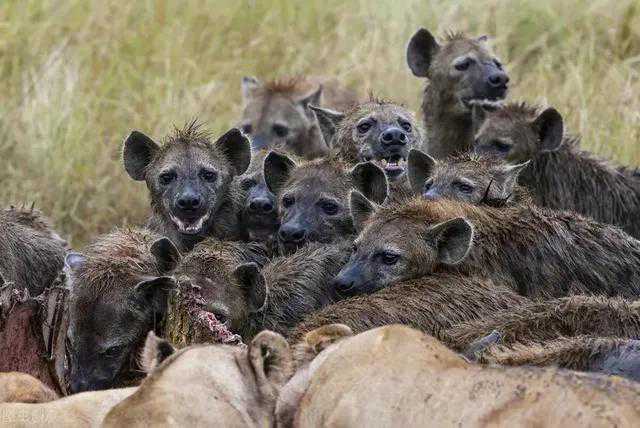 与狮群一样,斑鬣狗群体的主要力量是雌性,它们一生都会待在群体里,彼此之间存在亲缘关系。不过与狮群中雄性为王不同,斑鬣狗群的首领是一只强壮的雌性,它享有优先进食权。