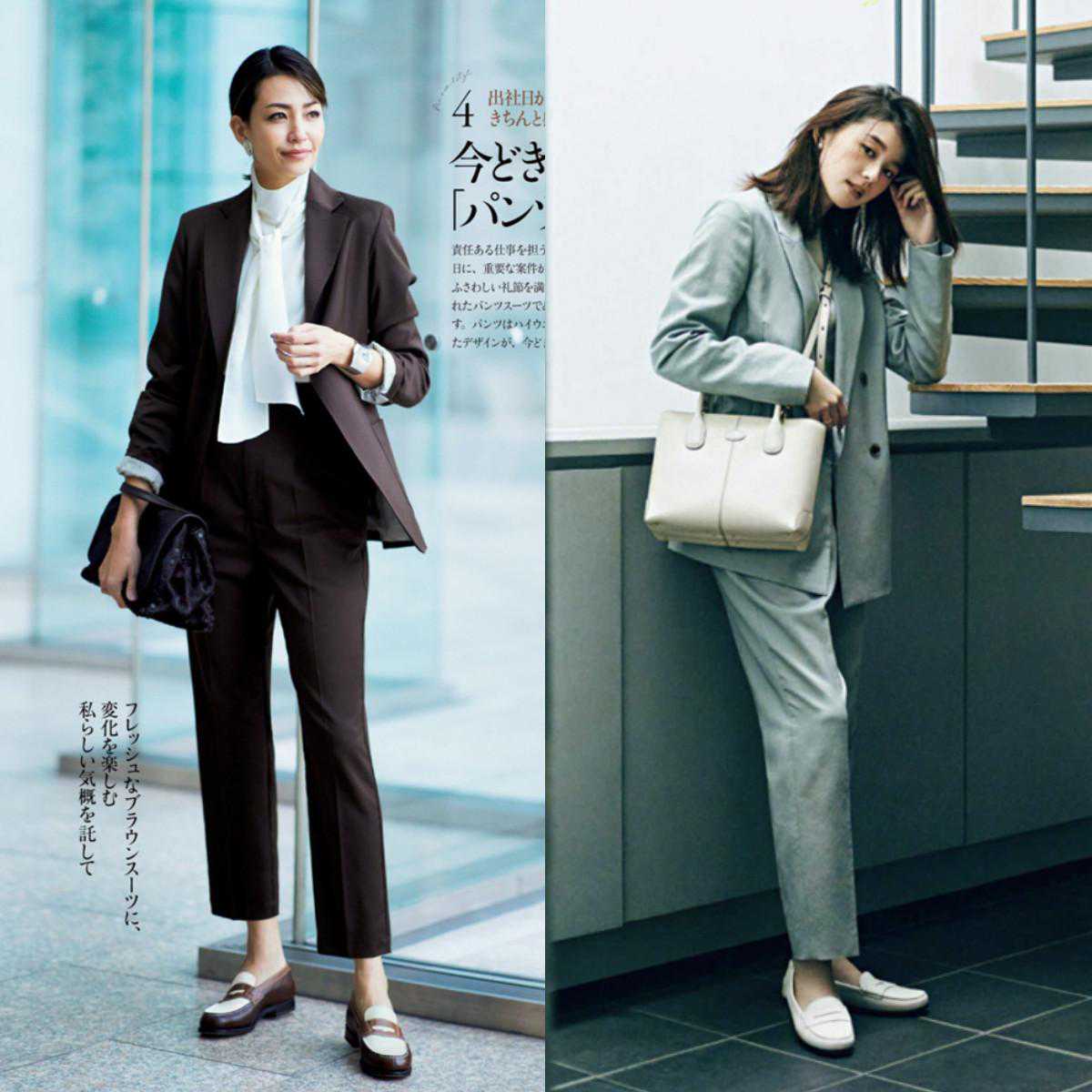 烟管裤的裤腿上宽下窄,呈“锥子型”,对大腿粗、小腿细的女人十分友好,上身后既能显腿细,又能显得利落、干练。在搭配乐福鞋时,建议大家选择能将“脚踝”露出来的长度,展现纤细的脚踝,不仅看起来更加正经一些,还能让你一键开启“瘦腿”滤镜,轻松get小细腿。