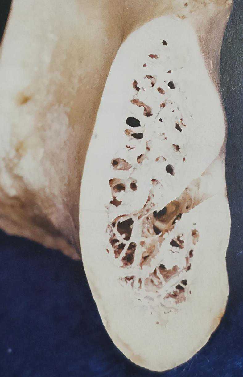 (下颌骨纵向剖面图,外层可见白色致密皮质骨,内层可见蜂窝状疏松松质骨)
