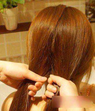 第二步:在脑后中间位置将中长发一分为二,分别用左右手握住。(如图所示)
