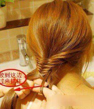 第四步:编织鱼骨辫的时候,发丝要拉的细一点,这样编织出来的鱼骨辫会更加的细腻精美的哟。(如图所示)
