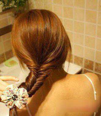 第四步:鱼骨辫编发一直编到发梢位置,用小皮筋扎住即可。