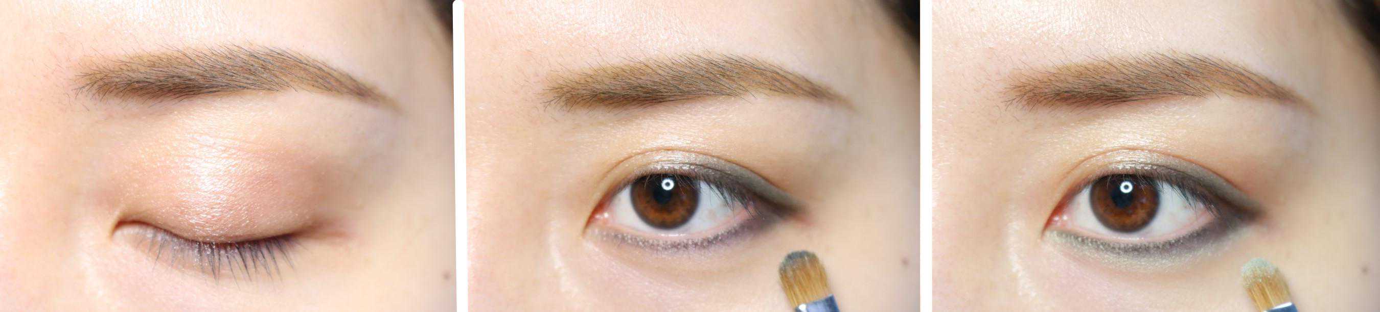 眼妆示范:step01:取适量香槟色眼影涂抹在上眼睑,做打底。step02:双眼皮眼褶尾部和下眼睑涂抹青绿色。step03:最后再取少量的青绿色涂抹在下眼睑。