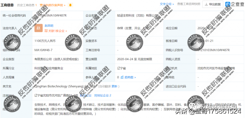 据企查查显示,轻涵生物科技(沈阳)有限公司成立于2021年1月21日,位于辽宁省沈阳市沈河区广昌路81-2号,注册资本1100万,实缴不详,法人代表赵英明任经理、执行董事,持股51%,为最大股东,公司第二大股东房连江任监事,持股49%。