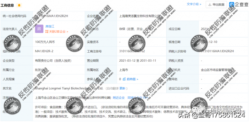据企查查显示,上海隆美添翼生物科技有限公司成立于2021年12月10日,位于上海市金山区金山卫镇秋实路688号9幢(金山新材料孵化器),注册资本100万,实缴不详,法人代表房连江任执行董事、法定代表人,持股比例100%。而房连江同时也是上段文字中我们所提到过的轻涵生物公司的监事。