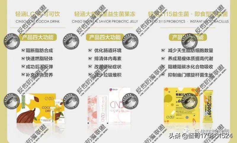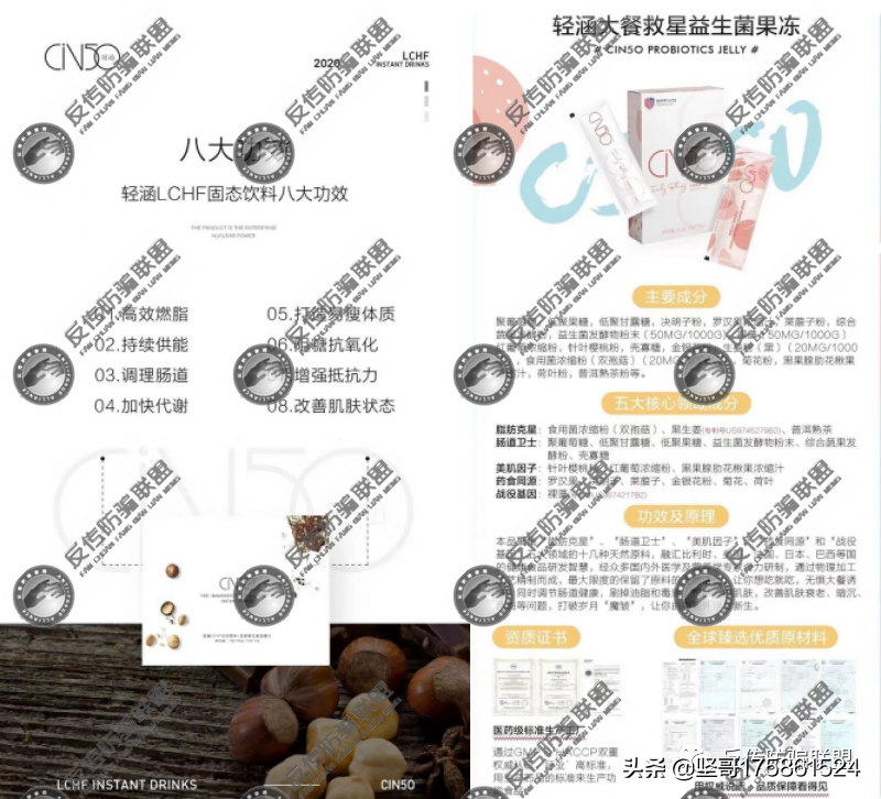 这款“轻涵LCHF固定饮料”宣称有高效燃脂、打造易瘦体质、调理肠道、增强抵抗力、改善肌肤状态等八大功效,而另一款“轻涵大餐救星益生菌果冻”则宣称能“调节肠道健康,刷掉油脂和健康,帮助亮白肌肤、改善肌肤衰老、暗沉、色斑等问题,打破岁月魔皱,让你由内到外焕发新生”。