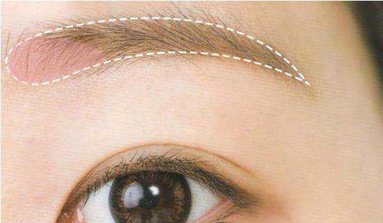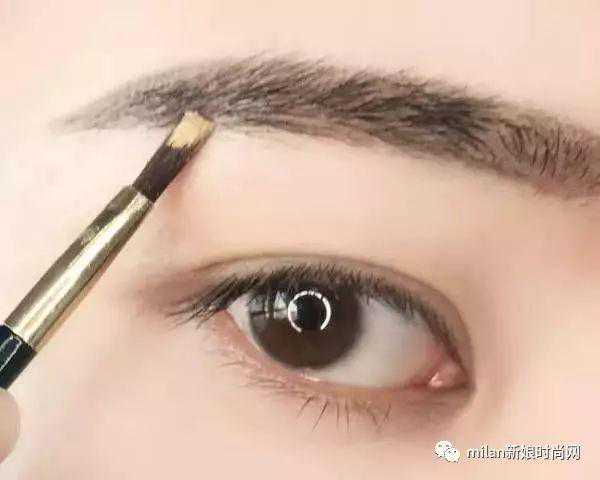 下图中缺失的眉头部位,不要用眉笔描绘,应该用浅色眉粉来填充。