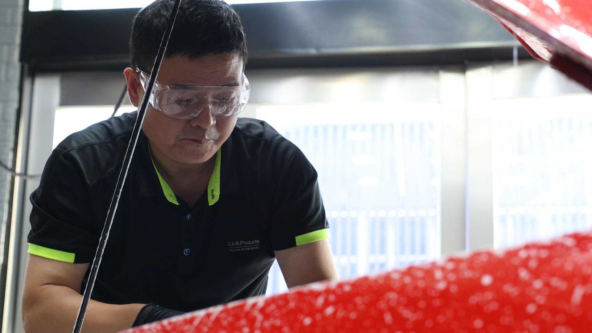 (李旭正在进行汽车美容)