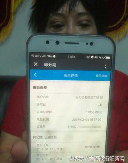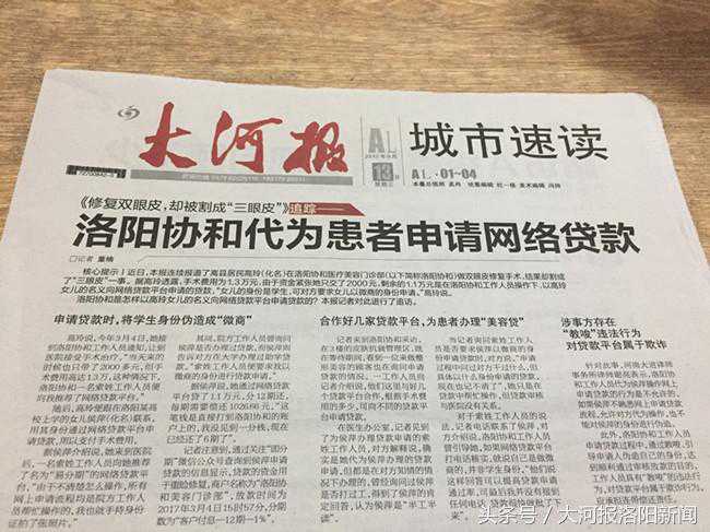 本报讯(记者董楠文图)近日,本报连续报道了嵩县居民高玲(化名)在洛阳协和医疗美容门诊部(以下简称:洛阳协和)做双眼皮修复手术,结果却割成了“三眼皮”一事。据高玲透露,手术费用为1.3万元,由于资金紧张她只交了2000元,剩余的1.1万元是在洛阳协和工作人员操作下,以高玲女儿名义向网络贷款平台申请的贷款,“女儿身份是学生,可对方要求女儿以微商的身份申请。”高玲说。