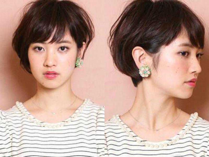 短发美眉可以试试这款日式斜刘海短发发型,头顶的发丝烫过后蓬蓬的,发尾短到紧贴着脖子,让头部显得尤为饱满立体,轻轻拨向一边的及眉短刘海打理出轻盈感,再将令一边的头发别在耳后,使得妹子的脸部轮廓清晰可见,从侧面看来五官更加的精致。
