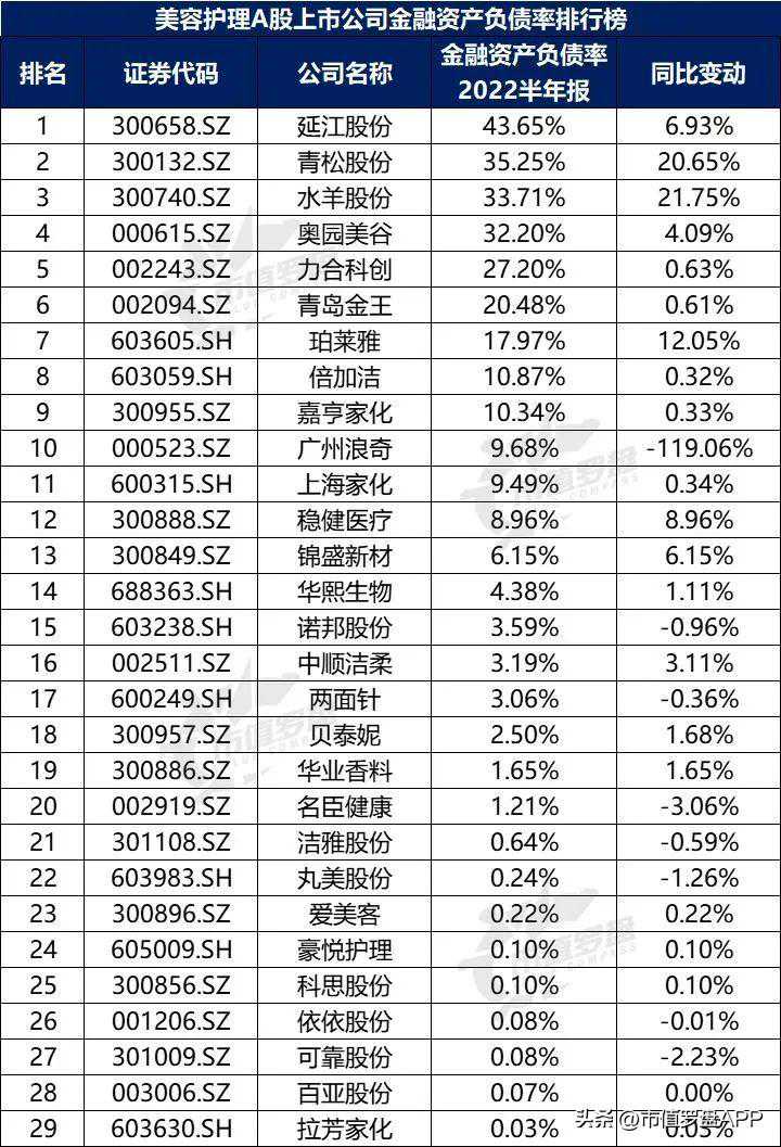 图19:美容护理行业A股上市公司金融资产负债率排行榜