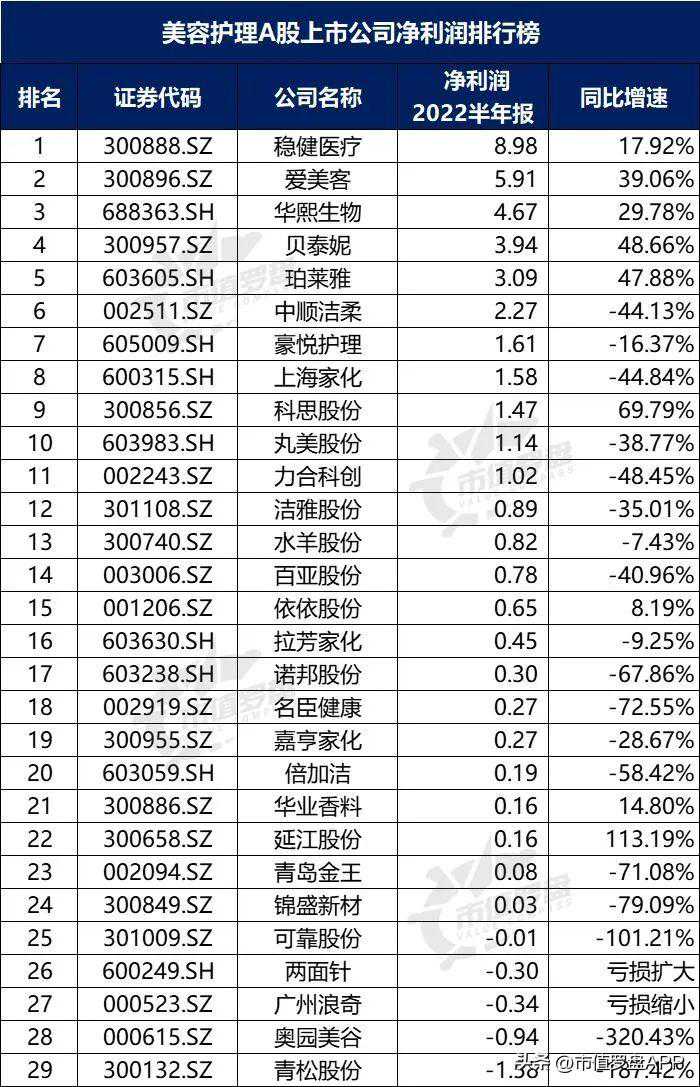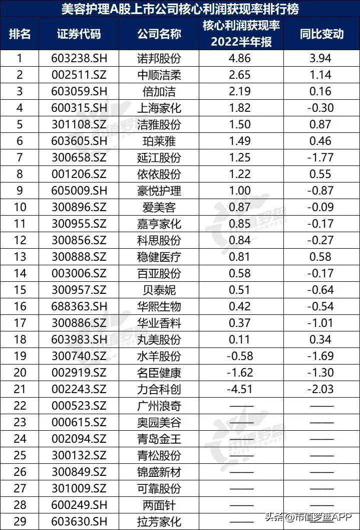 2022上半年美容护理行业A股上市公司6家核心利润增长,14家核心利润出现下滑。