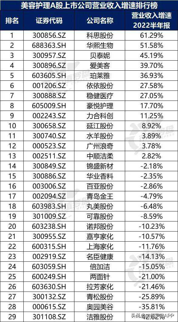 图6:美容护理行业A股上市公司营业收入增速排行榜
