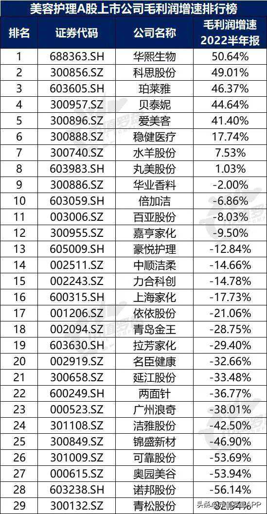 图7:美容护理行业A股上市公司毛利润增速排行榜