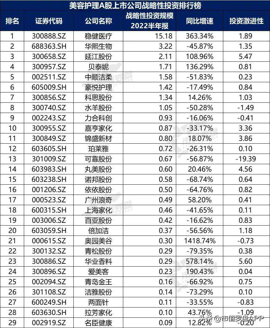 图17:美容护理行业A股上市公司战略性投资排行榜