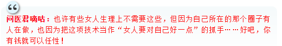 上上周,问医君接到一个闺蜜从美容院打来的电话,说美容院正在向她们这些老会员推介一项名为“私密保养”的新的美容业务。用一种激光设备,每次私处保养15分钟至20分钟,一次38000元,3次为一疗程,优惠价98000元。
