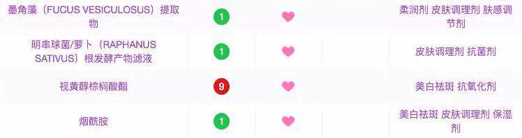 最厉害的是它含有墨角藻提取物,对皮肤有强大的修复力,烟酰胺等成分还可以美白,真的表现很优秀