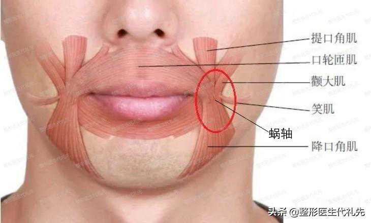 在解剖学上,这个位置就叫做蜗轴。蜗轴位于口角外侧缘区域的它在面部表情中起着极其重要的作用。随着年龄的增长,深层次的筋膜层出现松弛下垂,同时口角的降肌的肌束的角度开始由年轻时的90度角,逐渐地变成一个平角。导致向下的拉力增大,从而最终导致了口角囊袋,口角纹,木偶纹,嘴角下垂。