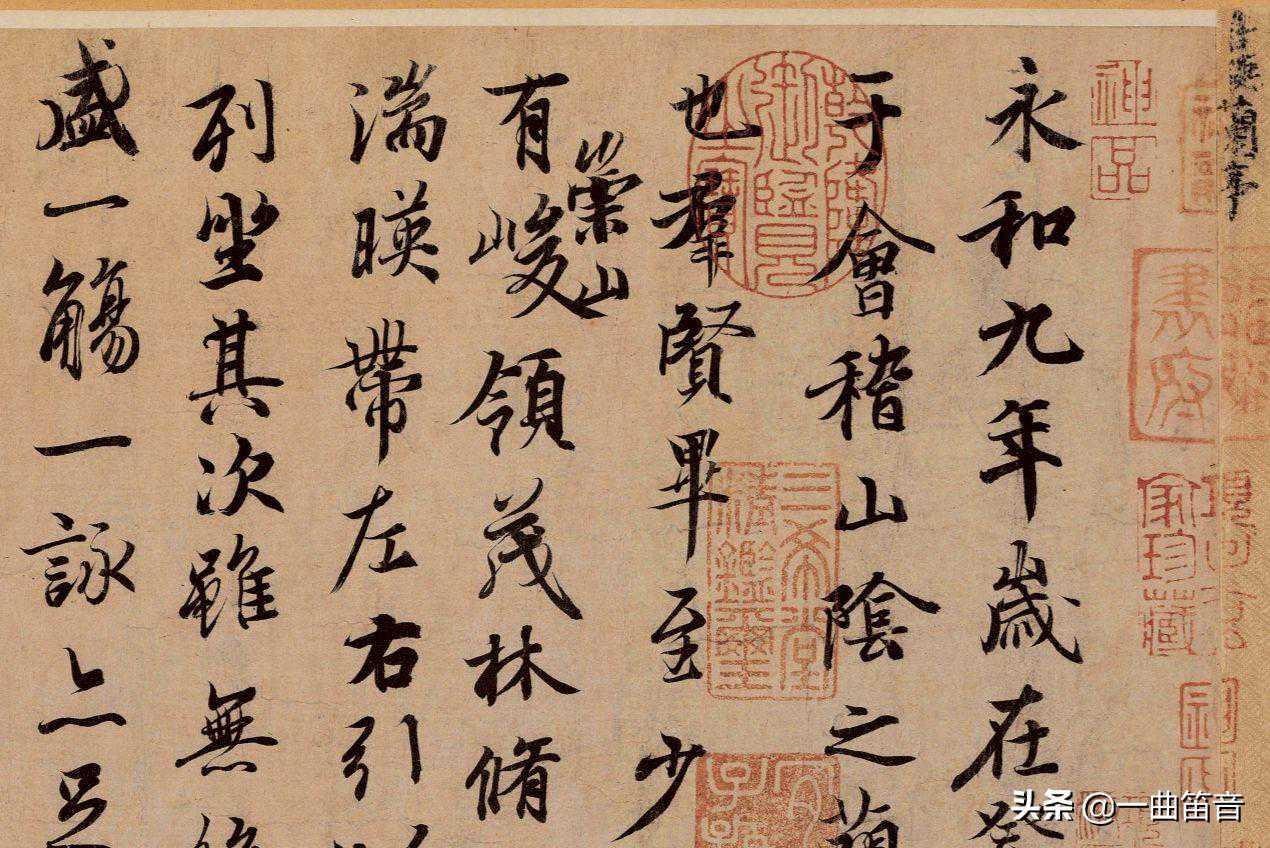 其中最著名的是右上角钤盖的“神龙”二字,这是唐中宗李显的年号,因年代久远,“神龙”二字只剩下左半部依稀可辨,故曰“神龙半印”,由此冯本《兰亭序》又称“神龙本”。“神龙”印用的很恰当,一是印章大小恰当,二是盖在兰亭序文起手处,符合帝王身份。