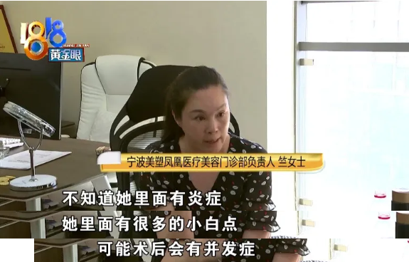 宁波美塑凤凰医疗美容医院负责人竺女士:“因为没打开不知道她里面有炎症,打开以后发现她里面有很多的小白点,然后在术前知情同意书里都签过,因为这个小白点,可能导致你术后有并发症。”