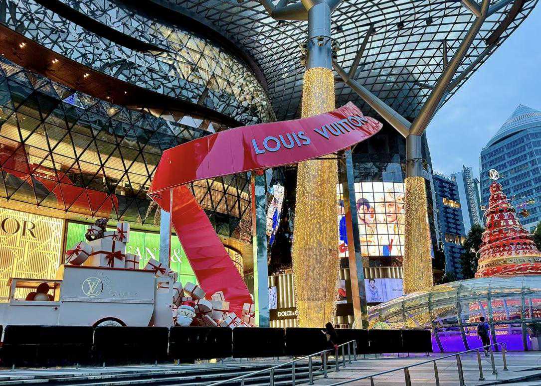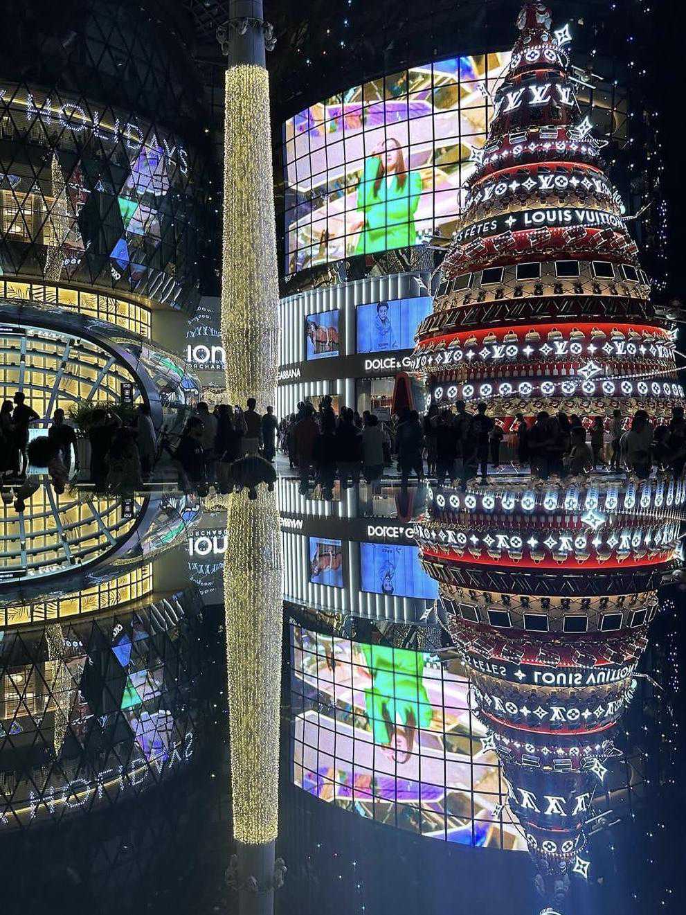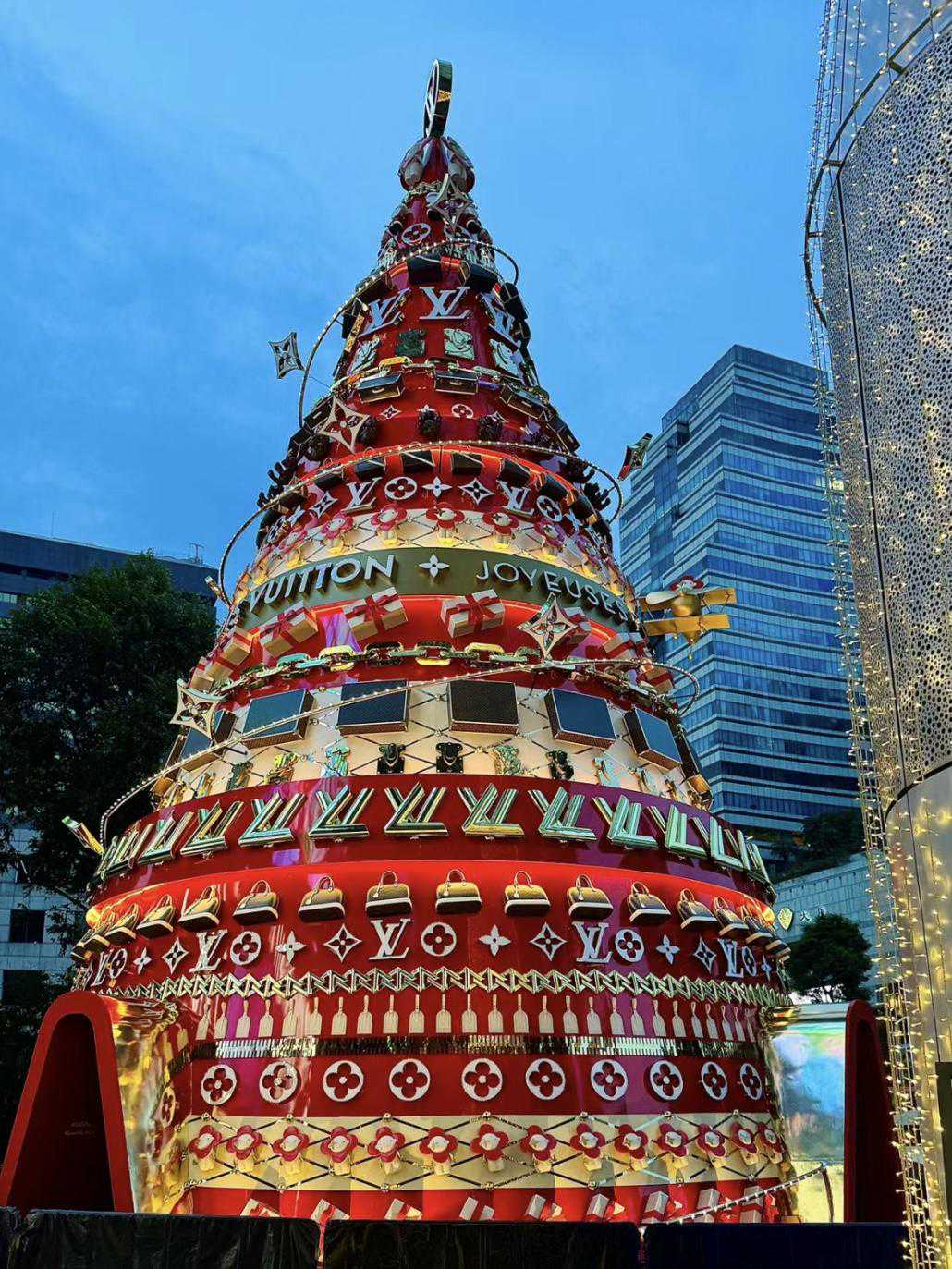 LouisVuitton圣诞树位于ION商场,夜晚华灯初上,假日树灯光倒映,提前感知节日氛围。
