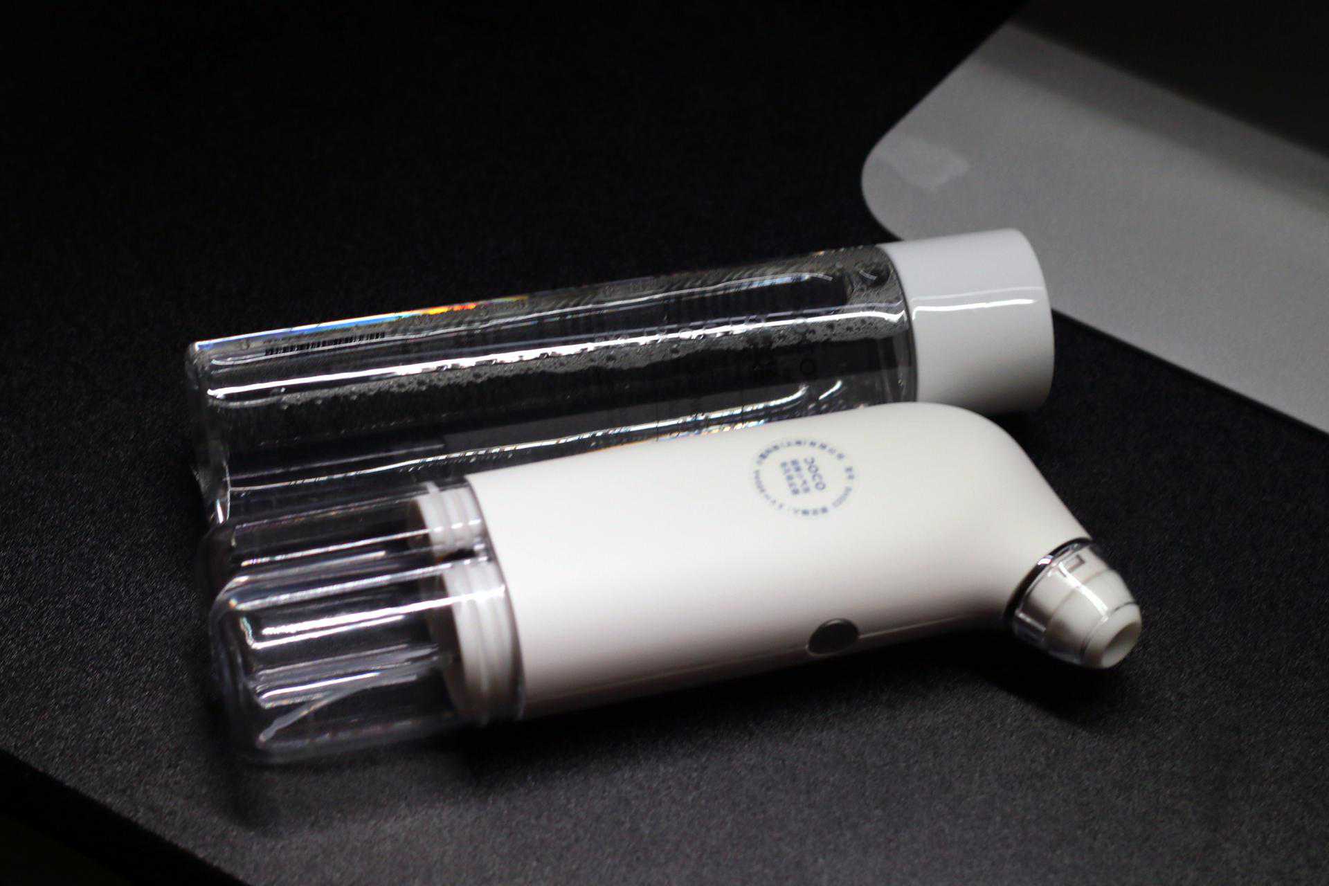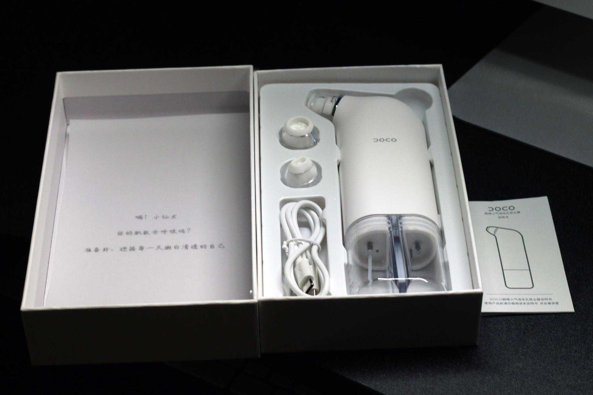 首先是简单的开箱。这款DOCO小气泡黑头仪的包装设计简约大方,正面产品主体造型一目了然,而上方DOCO品牌的标志也显得极具辨识度。